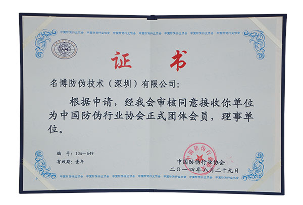 名博公司于1993年成立,是亞太防偽協(xié)會會員、中國防偽協(xié)會理事單位。公司集研發(fā)、生產、銷售為一體,專業(yè)提供各種防偽油墨、防偽材料、防偽制品,是中國知名防偽產品制造商之一。